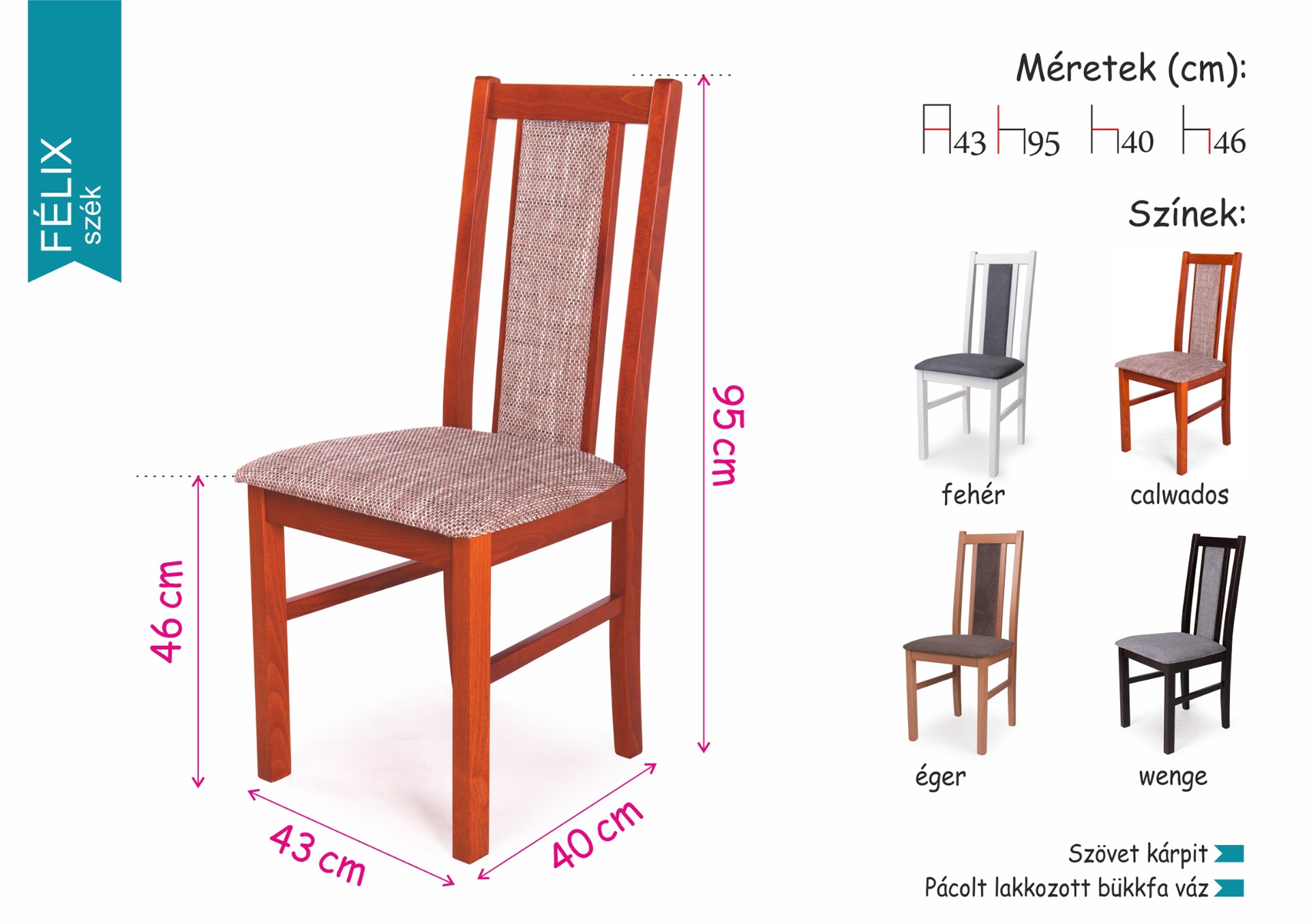 A pácolt lakkozott bükkfa vázzal készült székek a természetes vonalat viszik közelebb az otthonához. A Félix szék szövet kárpitjával hozzájárul ahhoz, hogy stílusos, kényelmes és otthonos ülőfelületek álljanak rendelkezésre és garantálja az időtálló minőséget.