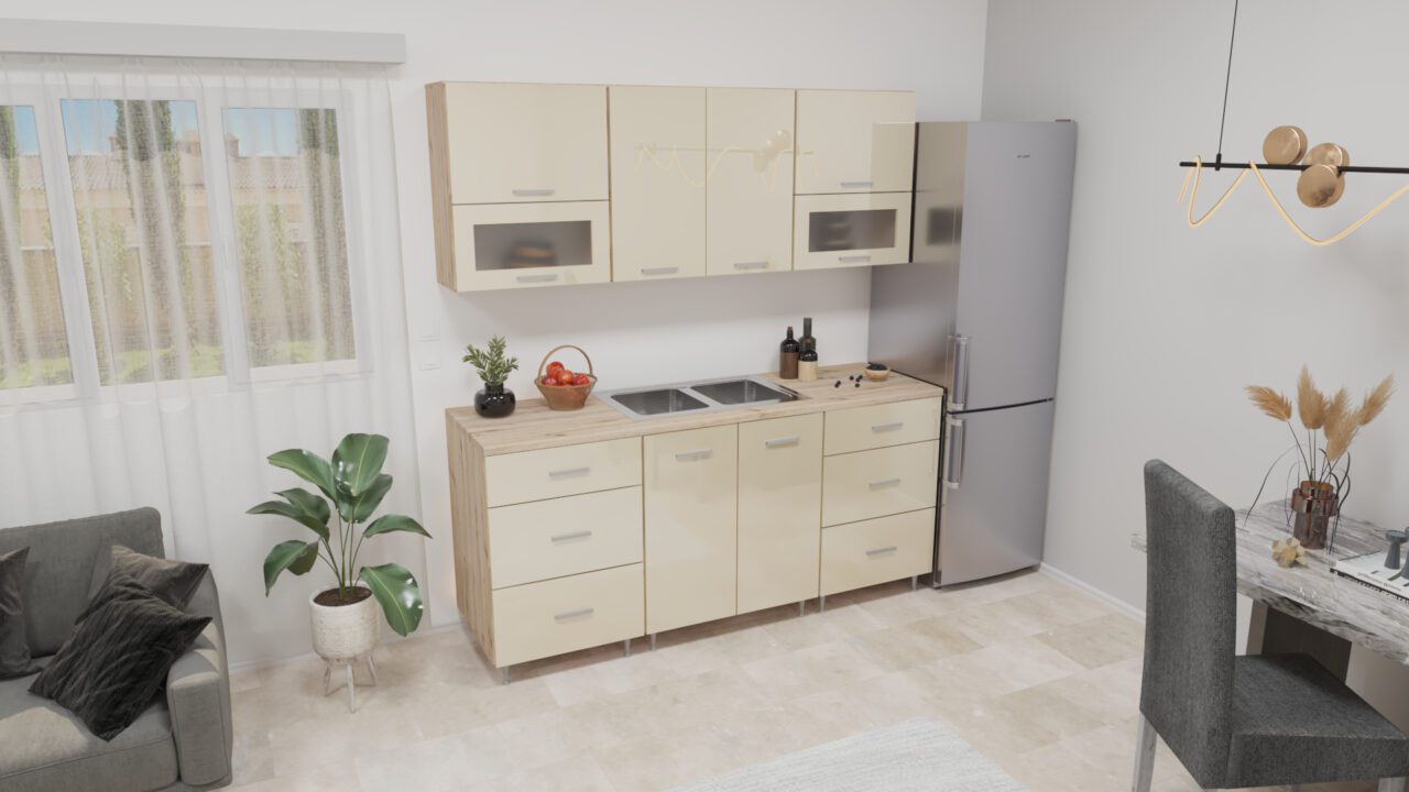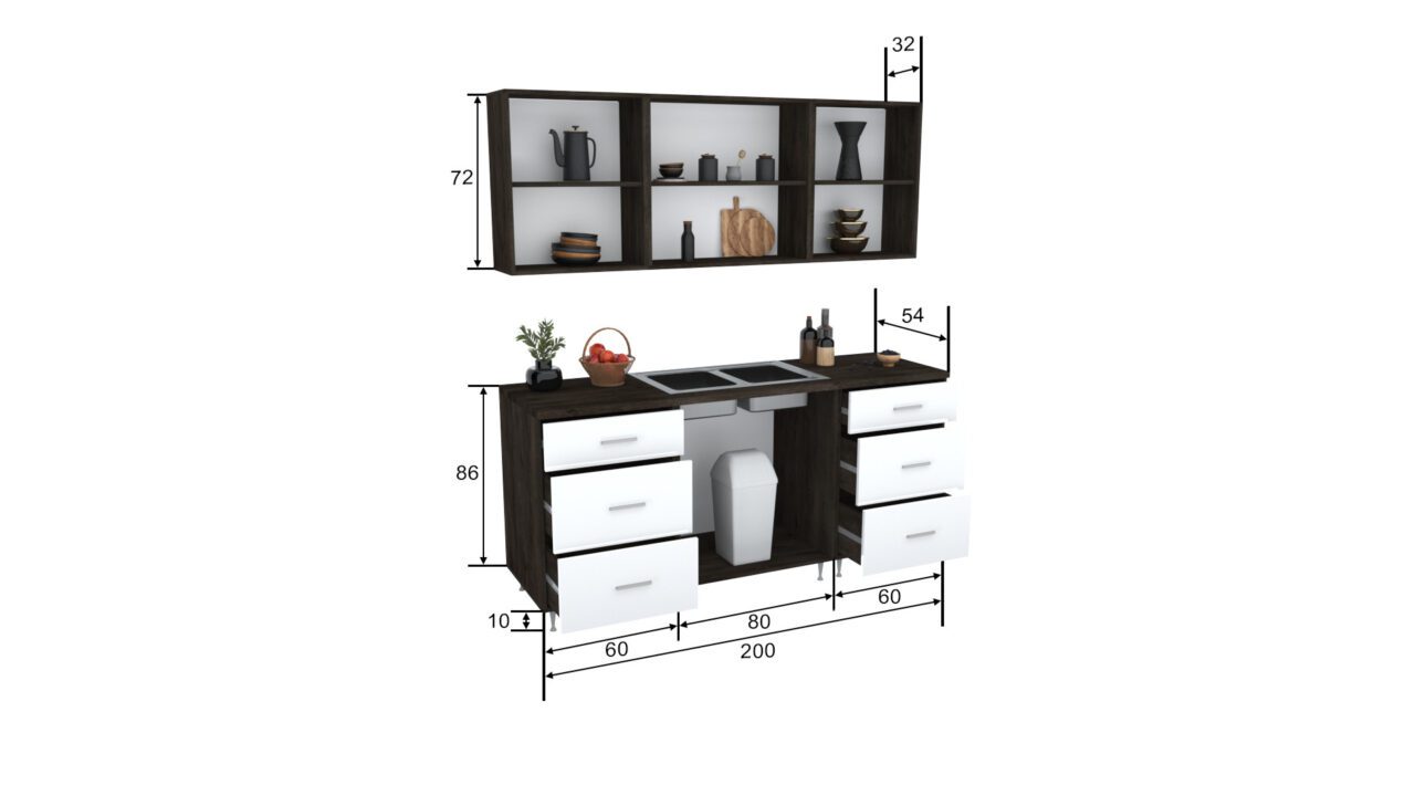 A korpusz 18 mm laminált forgácslap, ABS élfóliával zárva. Hátfal HDF lemez tűzőkapoccsal rögzítve. Az ajtófront magasfényű fóliás bútorlap ABS élfóliával zárva. A polcok alátámasztásai fém polctartóval vannak ellátva. A fiókok teljes kihúzású fióksínnel vannak ellátva. A felső felnyílós ajtók teleszkóppal vannak ellátva. A munkalap 38 mm vastagságú, mérsékelten hő- és vízálló. Mosogatótálca ( dupla mély munkalapba belevágható ) rozsdamentes, szifonnal, lefolyóval. A mosogatótálcát a helyszíni beszerelésnél kell a munkalapba belevágni. Fali belső felfüggesztő tartozéka a bútornak. Fém fogantyúkkal kerül forgalomba.