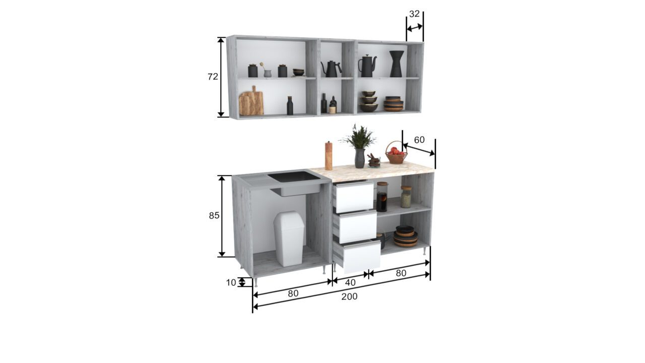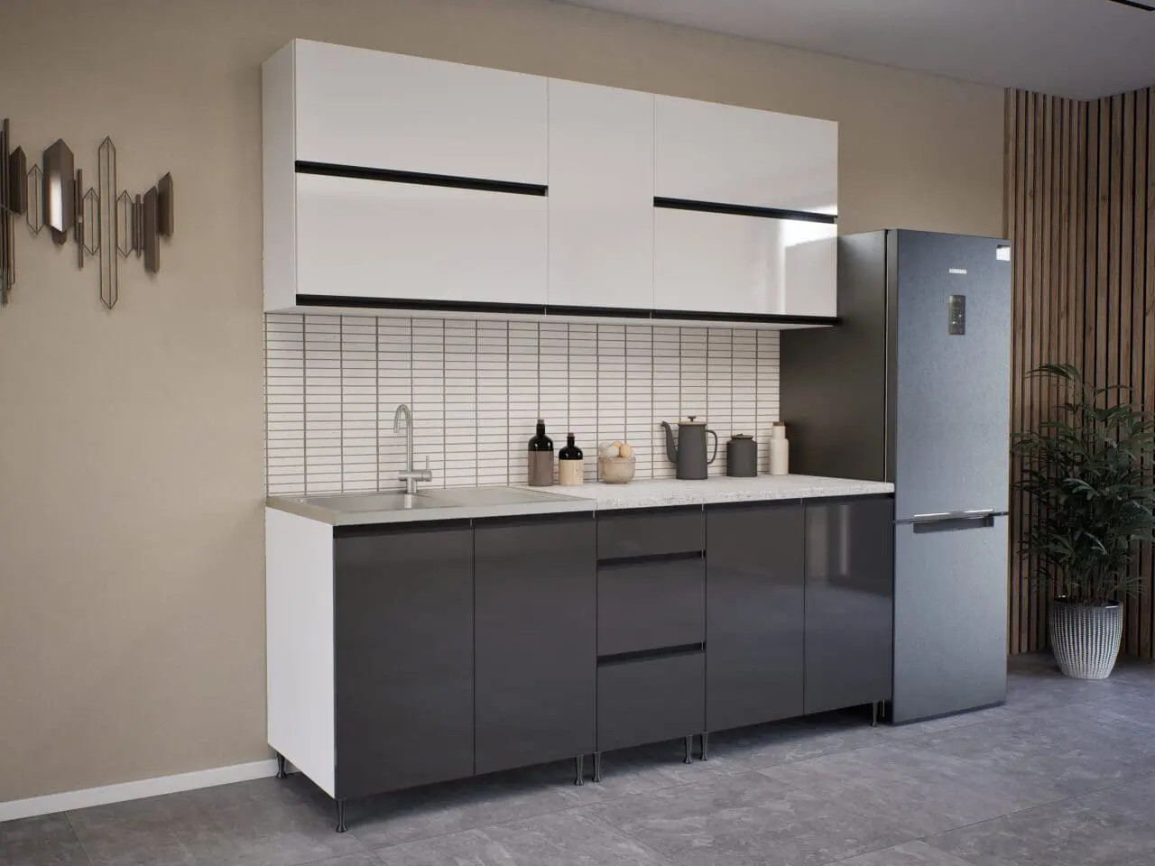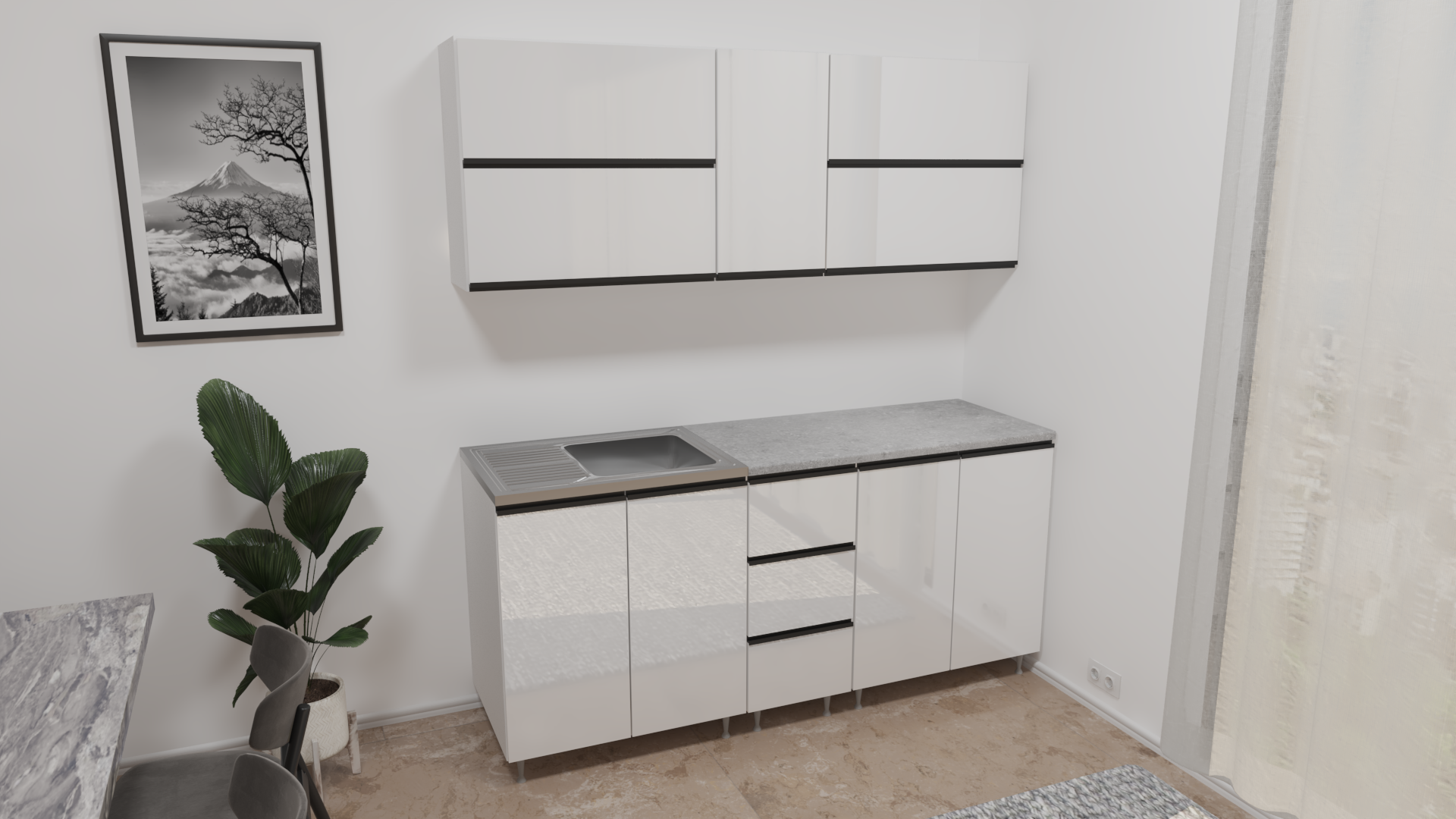 Modern blokk konyha . Az ajtók, fiókok fogóprofillal vannak ellátva. A korpusz 18 mm laminált forgácslap, ABS élfóliával zárva. Hátfal HDF lemez tűzőkapoccsal rögzítve. Az ajtófront magasfényű fóliás bútorlap ABS élfóliával zárva. A polcok alátámasztásai fém polctartóval vannak ellátva. A fiókok teljes kihúzású fióksínnel vannak ellátva. A munkalap 28 mm vastagságú, mérsékelten hő- és vízálló, és csak beton ( szürke) színben rendelhető. Mosogatótálca ( 1 mély + csepegtetős ráépíthető ) rozsdamentes, szifonnal, lefolyóval. Fali belső felfüggesztő tartozéka a bútornak.