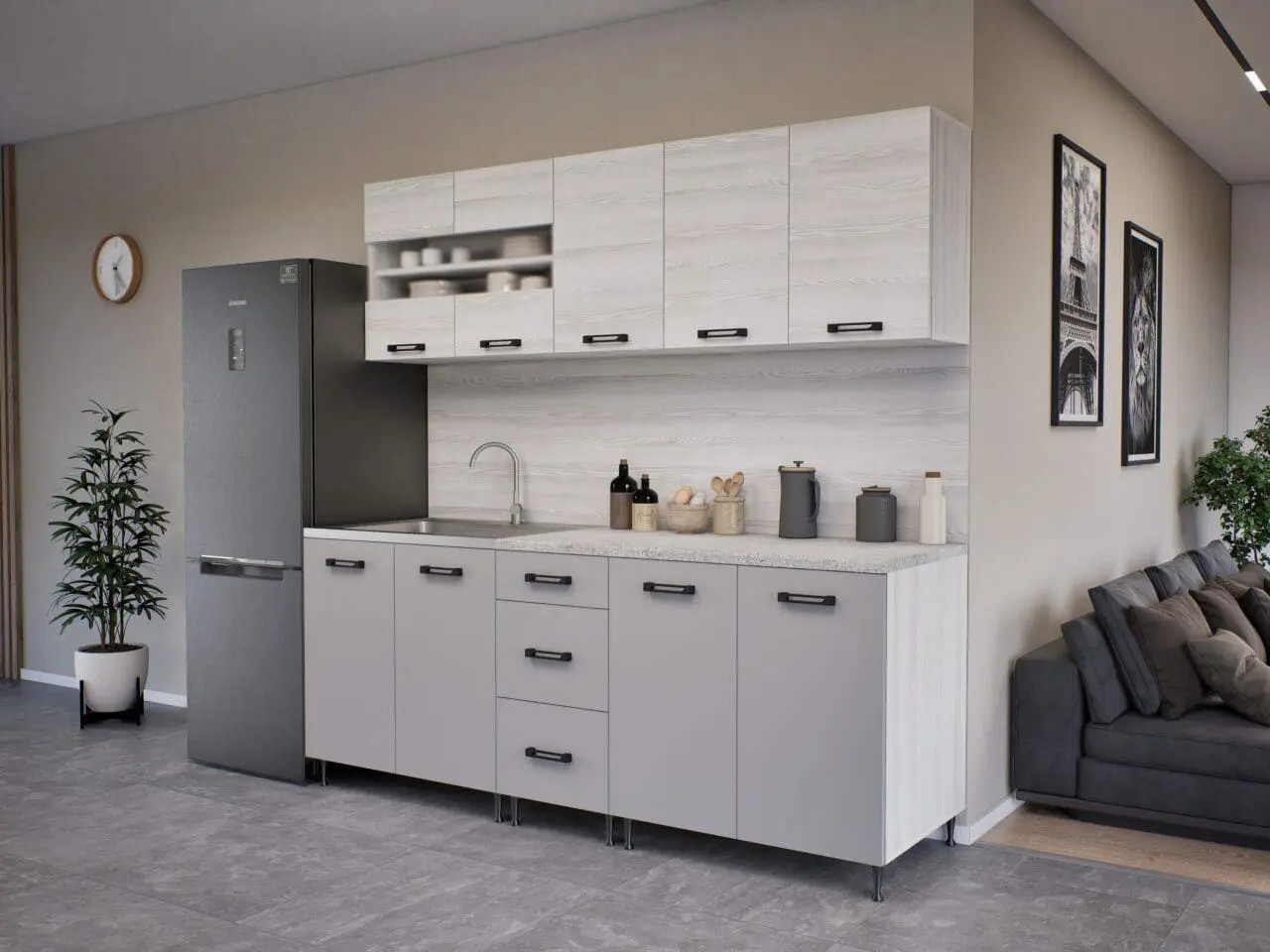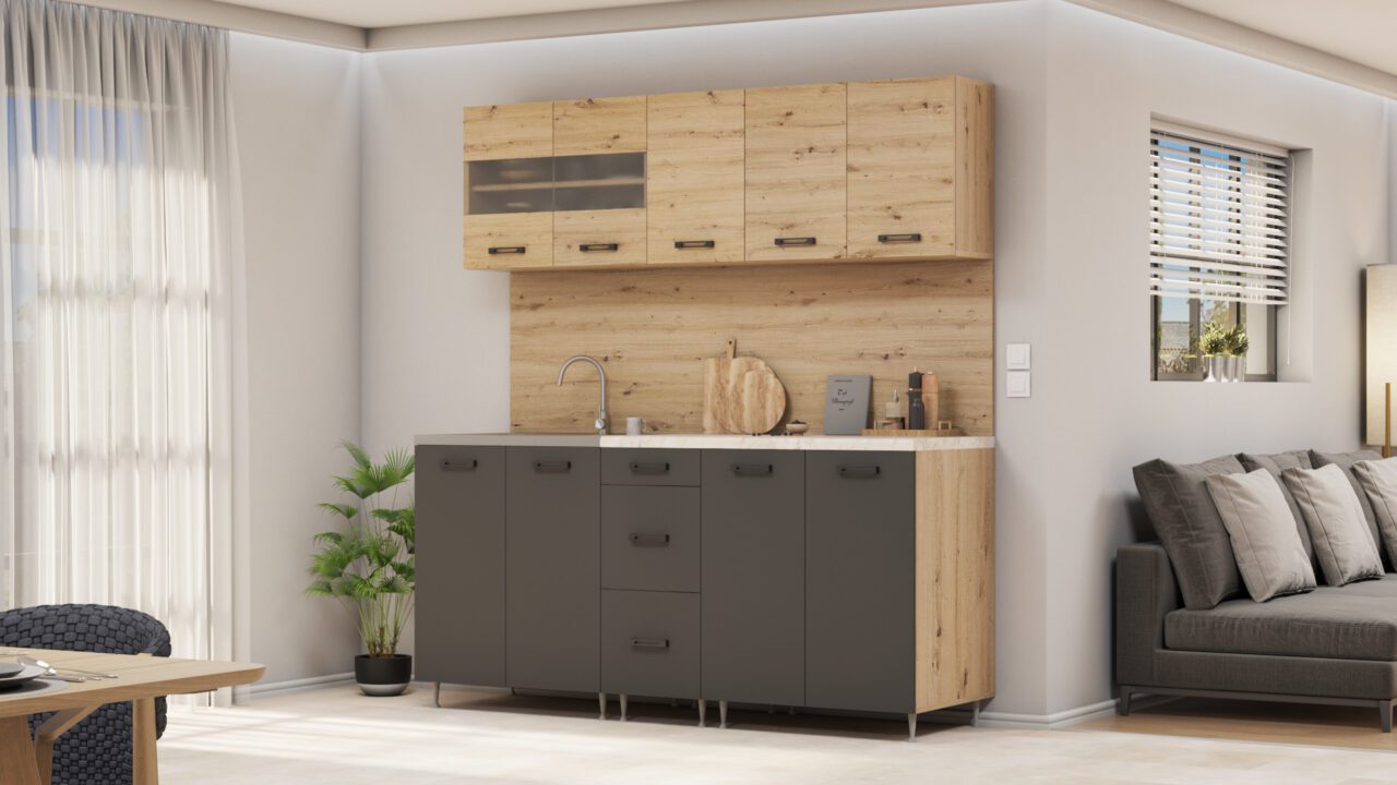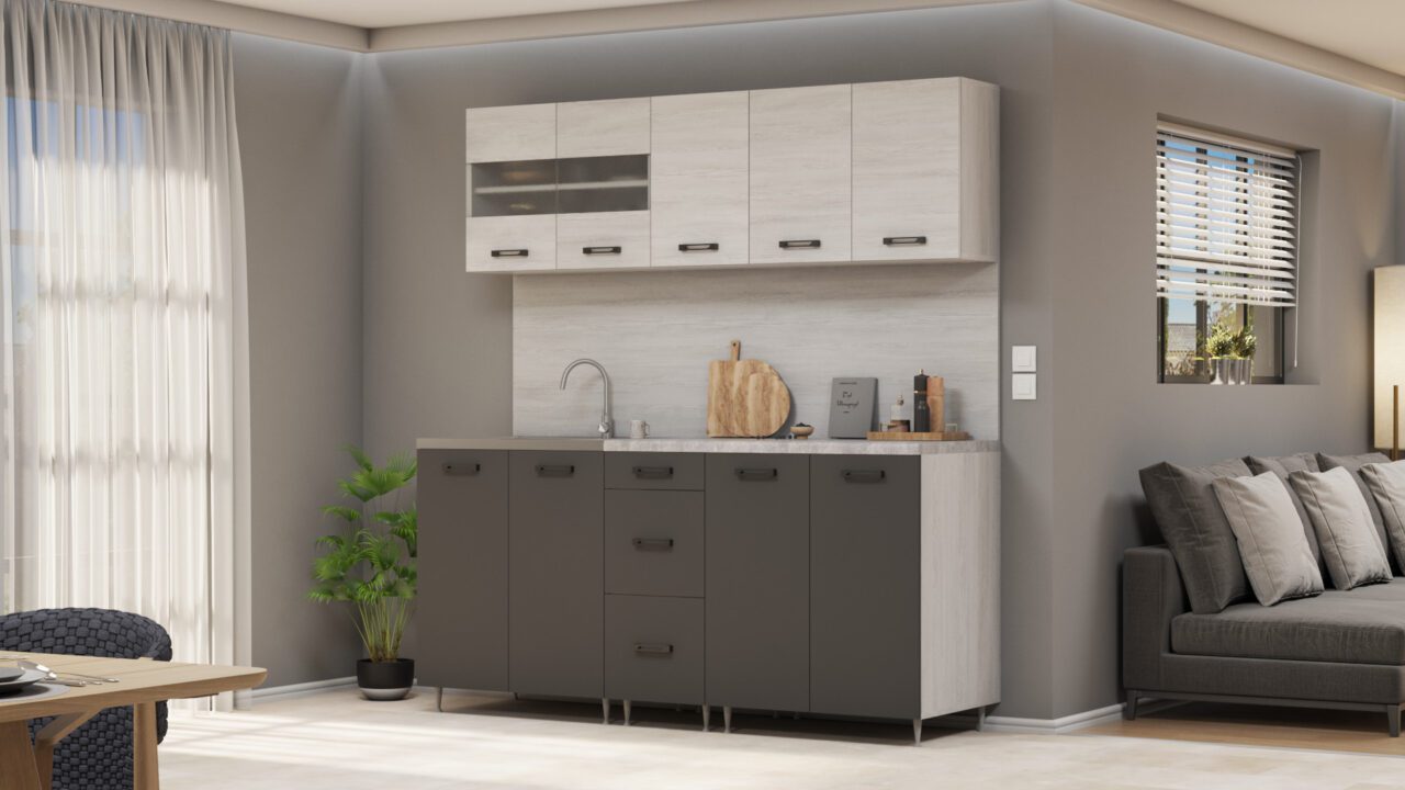 A korpusz 18 mm laminált forgácslap, ABS élfóliával zárva. Hátfal HDF lemez tűzőkapoccsal rögzítve. Az ajtófront magasfényű fóliás bútorlap ABS élfóliával zárva. A polcok alátámasztásai fém polctartóval vannak ellátva. A fiókok teljes kihúzású fióksínnel vannak ellátva. A munkalap 28 mm, mérsékelten hő- és vízálló. Mosogatótálca ( dupla mély ráépíthatő ) rozsdamentes, szifonnal, lefolyóval. Fali belső felfüggesztő tartozéka a bútornak.