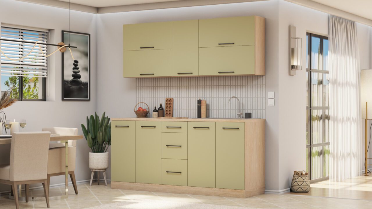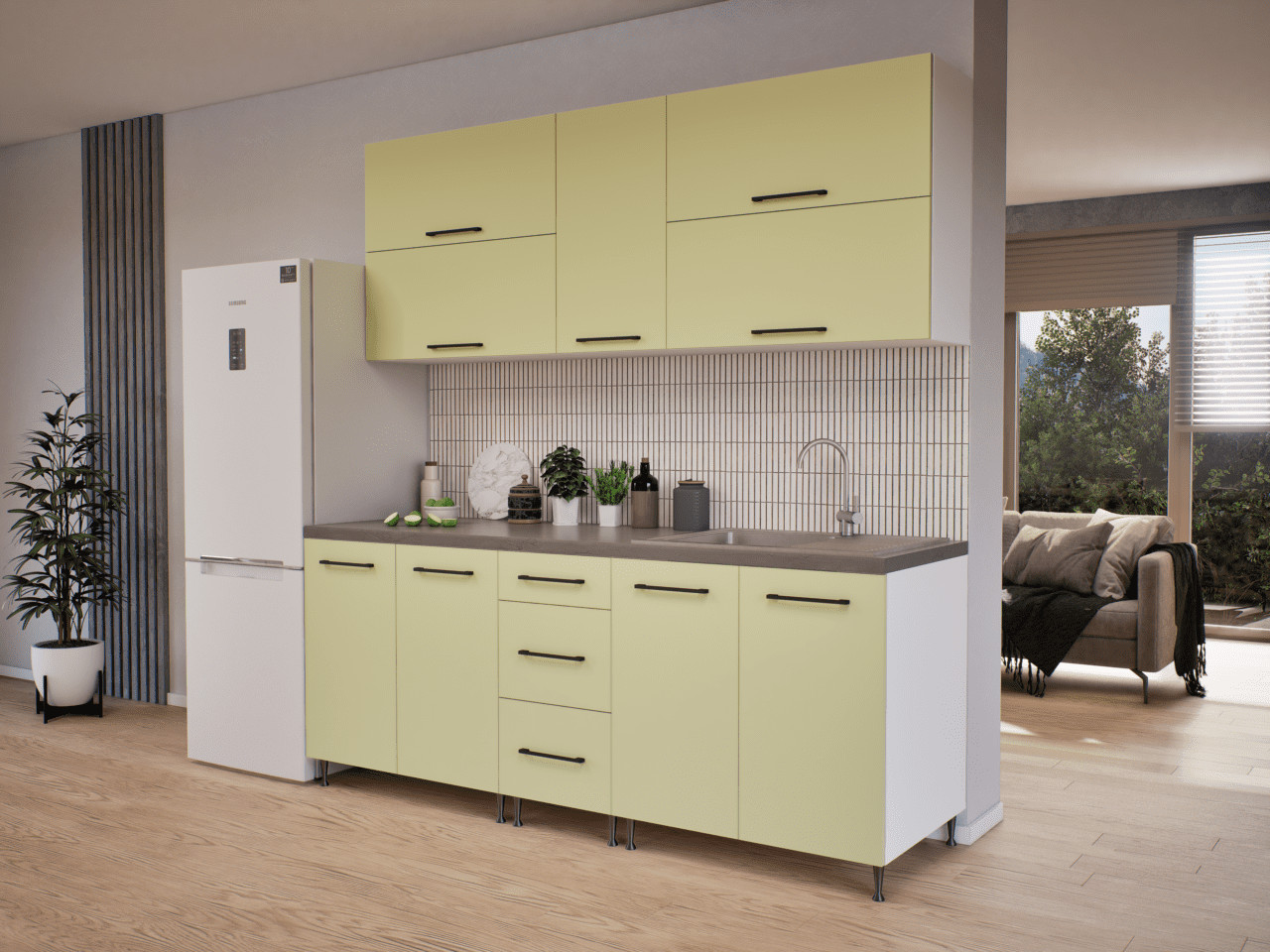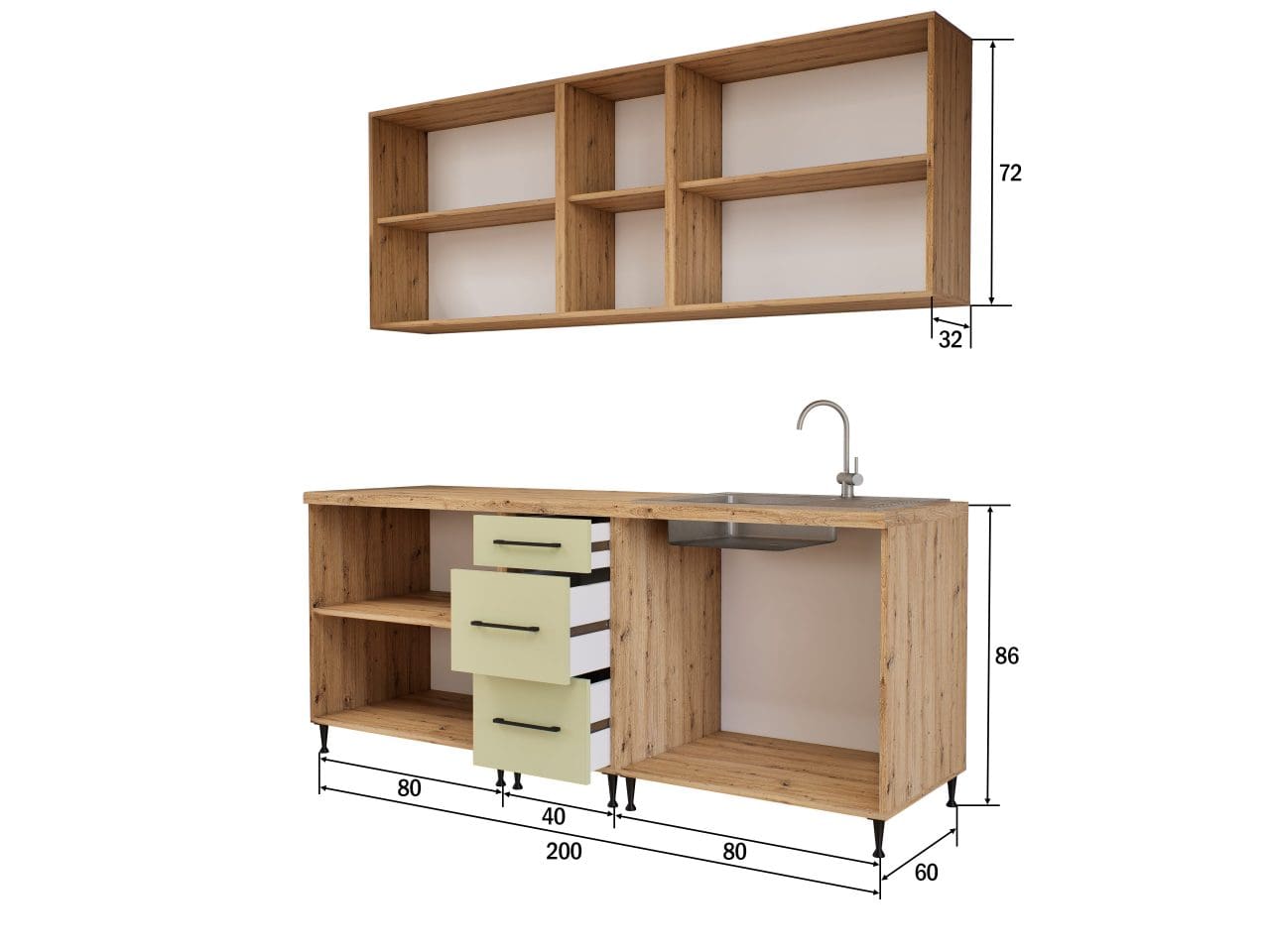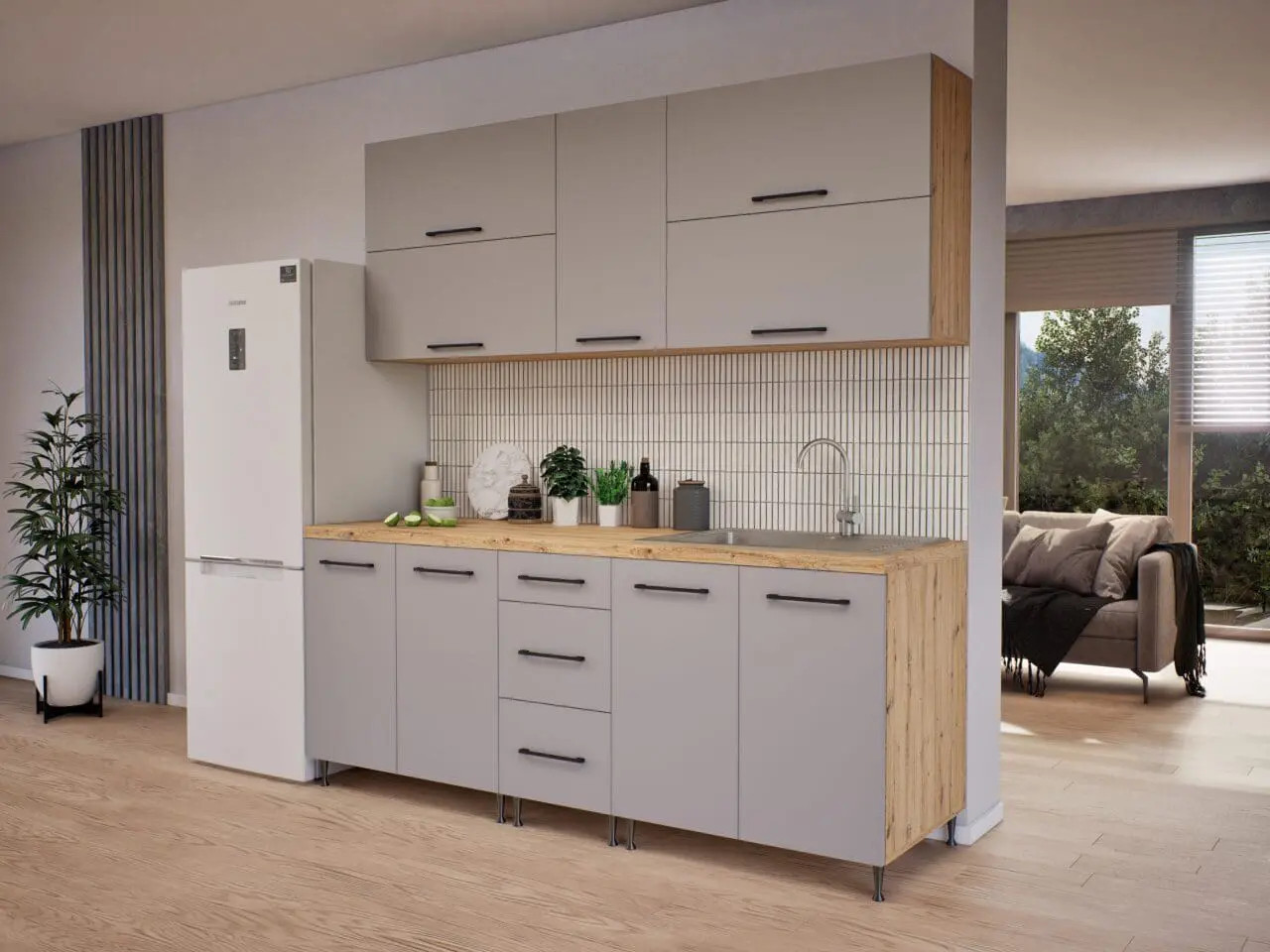 Modern kivitelű konyhabútor, 72 cm magas felső elemekkel. A korpusz 18 mm laminált forgácslap, ABS élfóliával zárva. Hátfal HDF lemez tűzőkapoccsal rögzítve. Az ajtófront fóliás bútorlap ABS élfóliával zárva. A felső felnyílós ajtók teleszkóppal vannak ellátva. A polcok alátámasztásai fém polctartóval vannak ellátva. A fiókok teljes kihúzású fióksínnel vannak ellátva. A munkalap 38 mm, mérsékelten hő- és vízálló. Mosogatótálca ( dupla mély belevághatós ) rozsdamentes, szifonnal, lefolyóval. Fali belső felfüggesztő tartozéka a bútornak.
